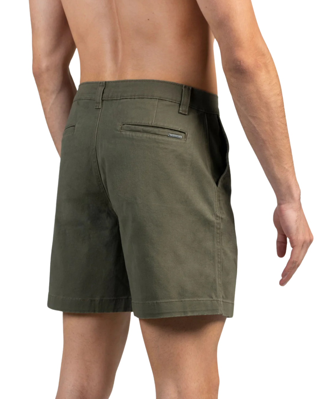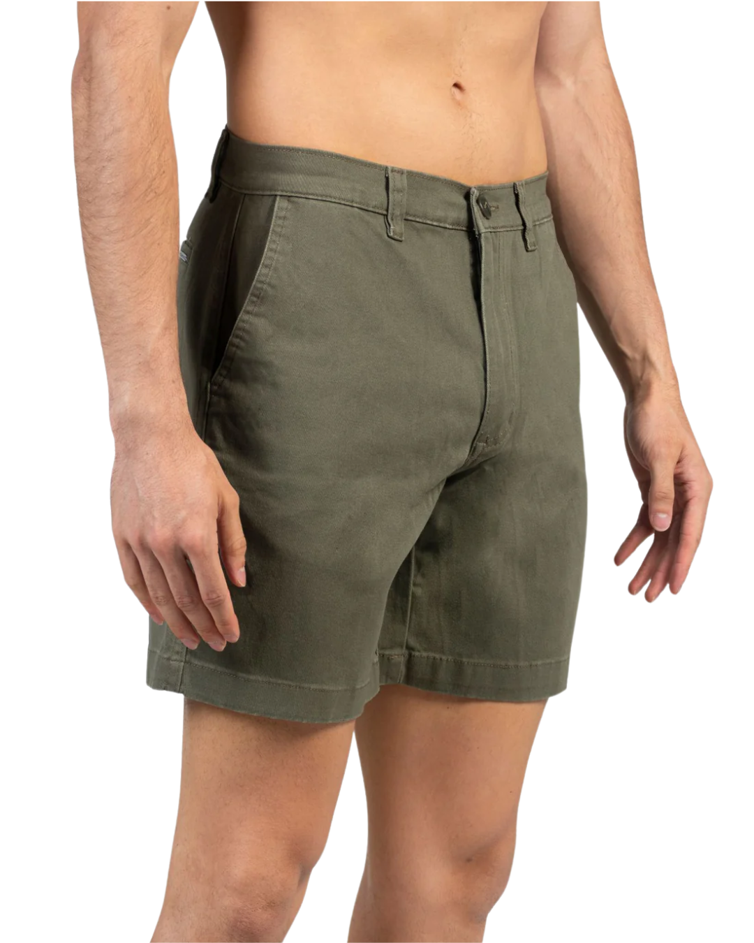 Bermuda en drill prelavado CIAMPINO color verde militar. Sus bolsillos son laterales diagonales, cuenta con botón, 5 pasadores de correa, cierre, dos bolsillos traseros y un punto de identificación de marca metálico en la parte trasera.